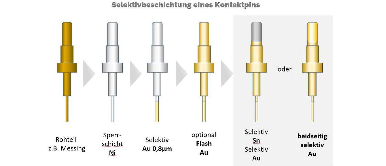 Unsere eigenständig entwickelten Selektivanlagen ermöglichen die selektive Oberflächenbeschichtung für elektrische Kontakte (Drehteile) für die Steckverbinderindustrie, mit Gold und/oder Zinn, von kleinen bis großen Serienmengen. Zusätzlich zur Goldeinsparung garantiert unser Verfahren die gleiche Funktion wie bei einer Standard-Komplettvergoldung. Je nach Schichtdickenvorgabe ist das Edelmetall-Einsparungspotenzial dabei überproportional hoch bei gleichbleibender Qualität und Funktionalität. Unser Angebot von selektiven Goldschichten auf der Steckseite und selektiven Zinnschichten auf der Löt- oder Crimp-Seite ermöglicht neben der Goldkosteneinsparung auch Funktionsverbesserungen bei Löt- oder Crimp-Anwendungen.