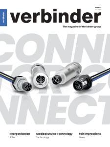 Responsible according to German press law Markus Binder Editorial office Rötelstraße 27 74172 Neckarsulm (GER) Tel. +49 (0) 71 32 325-302 Fax +49 (0) 71 32 325-150 marketing@binder-connector.de Published by Franz Binder GmbH & Co. Elektrische Bauelemente KG Rötelstraße 27 74172 Neckarsulm (GER) Tel. +49 (0) 71 32 325-0 Fax +49 (0) 71 32 325-150 info@binder-connector.de www.binder-connector.de General Manager Markus Binder Editors Pascal Kobia, Timo Pulkowski Art Direction venice branding GmbH An der Bachmühle 6 74821 Mosbach (GER) hello@venicebranding.de www.venicebranding.de Printing Laub KG Brühlweg 28 74834 Elztal-Dallau (GER) All rights reserved. Reprinting, inclusion in online services and reproduction on data storage media only with the permission of the publisher. CREDITS A warm thank you to everyone who has written articles for this issue! It is only through you that a magazine can come into being, only through you that ideas are generated, only through you that the verbinder comes to life. Feel like writing something? Then please send in your idea for an article – the moment one issue of the verbinder is finished, it‘s time to start the next one!! Editorial team Credits I Fotoatelier M Images p.3, p.7, p.14, p.21, p.33, p.36, p.39, p.41 I venice branding Gmbh Images p.10, p.14, p.20, p.38 - Illustrations from www.flaticon.com p.16, p.19, p.32 I Franz Binder GmbH & Co. Elektrische Bauelemente KG Images p.15, p.21, p.22, p.23, p.26, p.27, p.28, p.29, p.30, p.31, p.32, p.33, p.34, p.35, p.36, p.37, p.39 I Yellow duck/shutterstock.com Illustrationen p.12, p.13 I Ugraphics/shutterstock.com Illustrations p.40 I magele-picture/ stock.adobe.com Illustration p.18 I Scriblr/stock.adobe.com Illustration p.20 I SIMCON kunststofftechnische Software GmbH Illustration p.17 BOILERPLATE We wish you and your families a peaceful Christmas season and a good start to the new year 2025. Stay healthy and enjoy the festive season with your loved ones. Merry Christmas and all the best for 2025 MERRY X-MAS!